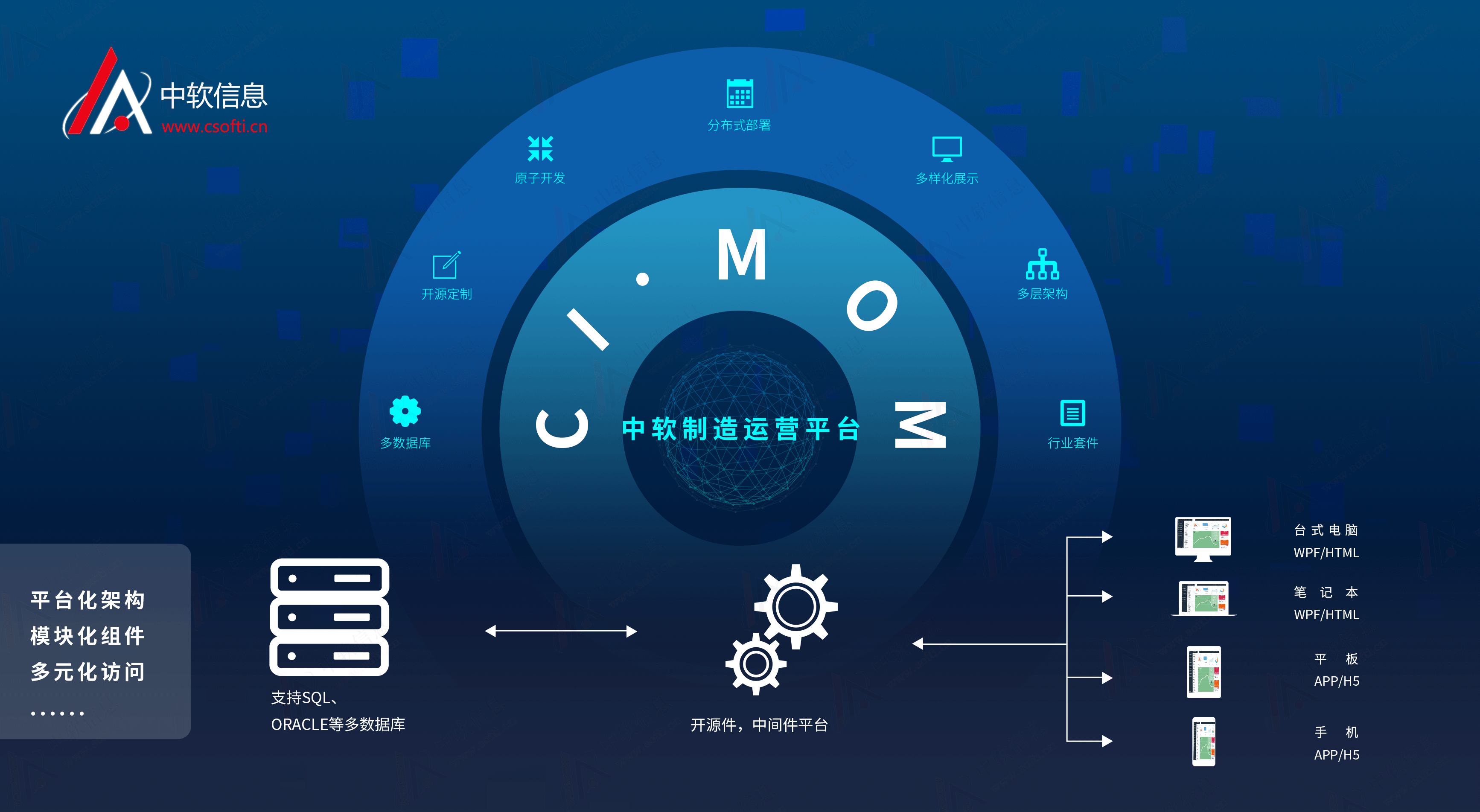 CI·MOM中软智造运营平台(简称:中软云智造)整合各行业生产运营管理业务管理为基础,以生产运行相统一的云智制造平台框架、扩展和细化生产执行、质量追溯和库存管理相关管控,使其与生产运行相互作用,更好地支撑制造数字工厂或智能工厂建设与实施落地。基于中软云智造主体框架进一步向集成化、标准化的方向发展,从而更易于实现内部或外部信息化集成和共享,更便于维护和升级。CI·MOM通过协调管理企业的人员、设备、物料、能源等资源,把原材料或者零件转化为产品的活动。包含管理由物理设备、人员和物料信息系统来执行的行为,并涵盖了管理有关调度、产能、产品定义、历史信息、生产装置信息,以及与相关的资源状况信息的数字化智能化管控。